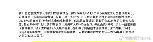 此前,播客节目《不合时宜》的创作者曾披露过节目一年的收入,该节目在小宇宙上拥有50多万粉丝,而其在2024年3月至11月期间,只拿到一单广告合作,会员收入大约为19万元,到手净利润约为13万元。