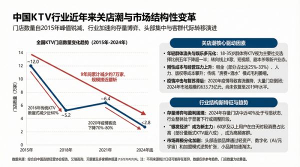曾经的线下娱乐之王KTV,正在经历一场漫长的退场。从2015年全盛时期的12万家,到2024年底萎缩至不足2.8万家,九年间约7万家门店消失,降幅近乎腰斩。这不仅是数据的剧变,更意味着传统社交模式的逐渐失宠。