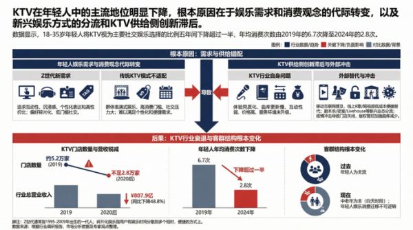 曾经作为年轻人聚会默认选项的KTV,如今正面临核心客群的大规模流失。数据显示,18-35岁的群体的KTV年均消费次从2019年的6.7次断崖式下跌至2024年的2.8次。这种变化并非偶然,而是年轻人娱乐需求与KTV陈旧供给模式之间的一次深度错位。