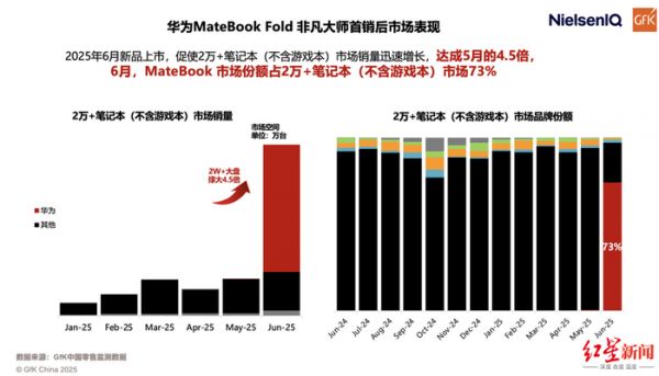 行业认可的背后,是市场用户的支持和信任。GFK数据显示,华为MateBook Fold 非凡大师在2025年6月上市首月,便创造了高端PC市场的增长奇迹:直接带动2W+价位段笔记本(不含游戏本)市场销量暴涨至5月的4.5倍,仅单款产品就占据该价位段73%的市场份额,成为销量冠军。这一数据不仅印证了高端用户对鸿蒙电脑独特价值的认可,更打破了传统高端PC市场的竞争格局,证明了鸿蒙系统在核心用户群体中的强大吸引力。