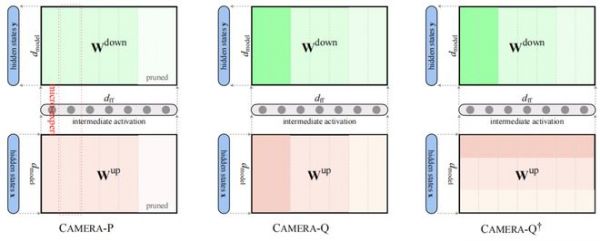 Camera-P 的目标是:按照设定的比例比如 20% 或者 40%,移除能量最低的那部分微专家。具体操作非常的结构化,对于一个被选中的冗余微专家,Camera-P 会将其对应的三个矩阵中的特定行或特定列同时置零或直接剪除。