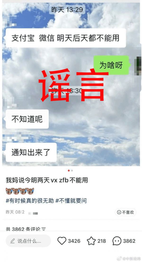 近日,在一些社交平台上,“12月30日、31日支付宝、微信支付不能使用”的消息流传。