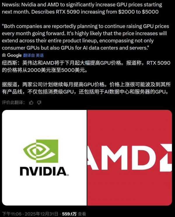 据一些科技媒体及供应链报告,英伟达、AMD 将在 2026 年初上调 GPU 价格。