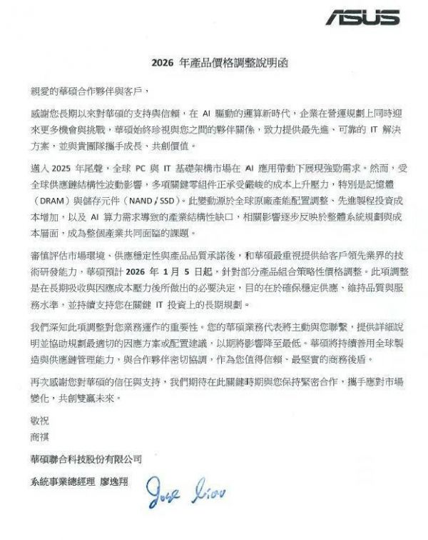 最近的反应来自华硕。根据官方声明,其将于 1 月 5 日起上调部分产品价格,理由是人工智能需求推动 DRAM 和存储成本上涨。