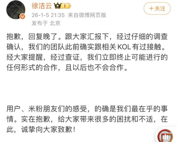 在无数米粉在雷军和徐洁云评论区讨厌说法后,徐洁云回应称,立即终止可能进行的任何形式的合作,且以后也不会合作。