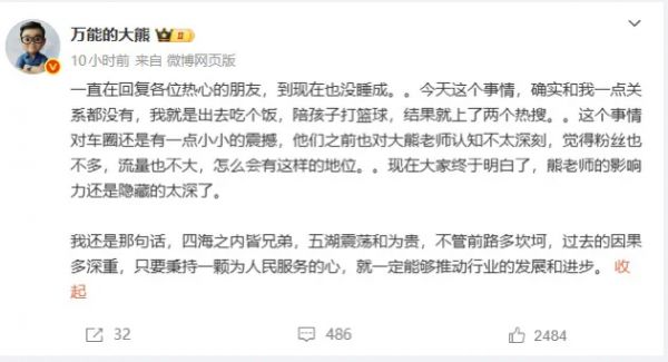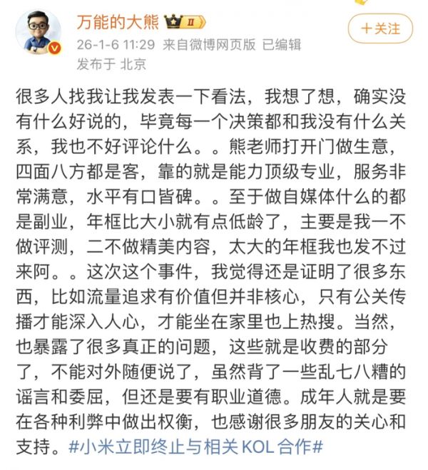 此外,昨日大熊再次回应,「很多人找我让我发表一下看法,我想了想,确实没有什么好说的,毕竟每一个决策都和我没有什么关系,我也不好评论什么。。熊老师打开门做生意,四面八方都是客,靠的就是能力顶级专业,服务非常满意,水平有口皆碑。。至于做自媒体什么的都是副业,年框比大小就有点低龄了,主要是我一不做评测,二不做精美内容,太大的年框我也发不过来阿。。」