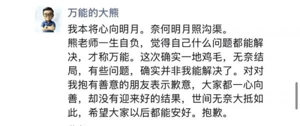 同时,其在朋友圈还发文,我本将心向明月。奈何明月照沟渠。熊老师一生自负,觉得自己什么问题都能解决,才称万能。这次确实一地鸡毛,无奈结局,有些问题,确实并非我能解决了。对对我抱有善意的朋友表示歉意,大家都一心向善,却没有迎来好的结果,世间无奈大抵如此,希望大家以后都能安好。抱歉。