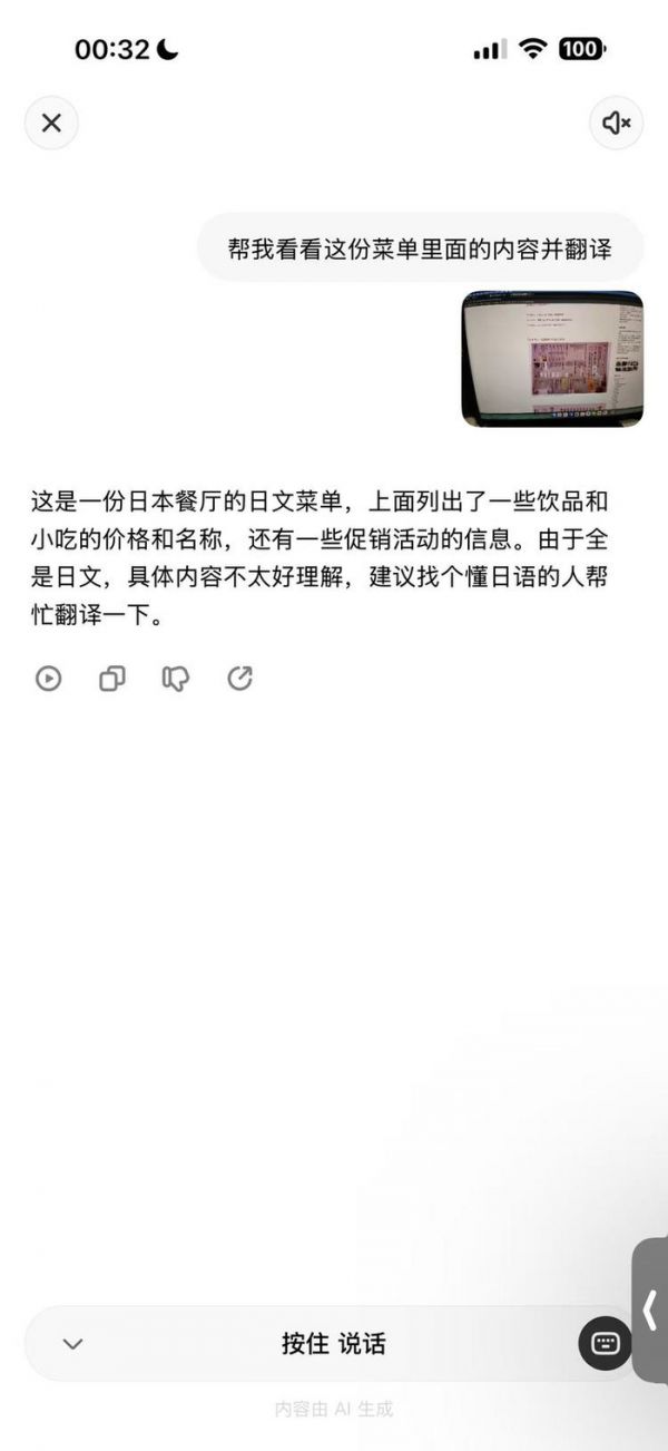 图源:不客观实验室关于“视觉问答”这一功能,其实使用过后大多数人都会觉得很“鸡肋”,因为演示的场景都是对着猫猫狗狗或者花花草草进行提问。我尝试让 Livis 帮我翻译翻译一份日式居酒屋菜单中的内容,试图让它帮我翻译整个菜单,但它却告诉我让我找一个会日语的朋友问问,真是帮了大忙了。