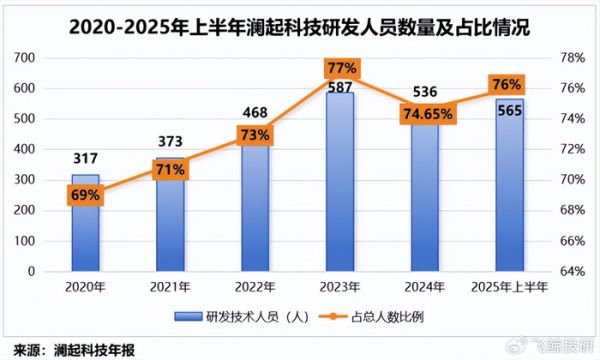 以2025年上半年为例,澜起科技的研发技术人员为565人,占公司总人数的比例约为76%;其中,具有硕士及以上学历的研发技术人员占比高达64%。