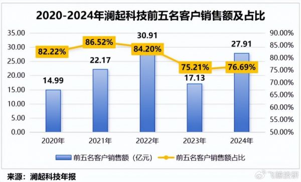 2020-2024年,公司前五大客户销售额从14.99亿元增长至27.91亿元,销售额占比也维持在75%以上。