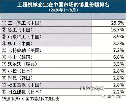 另一方面,在中国的液压挖掘机市场,拥有“三一”品牌的三一重工等当地企业的品质逐步改善。中国在低价格优势和政府的支持下,正在稳步提高份额。10年前,日本、欧美和韩国等的外资企业在中国市场占7成的销量份额,但目前中国企业占当地份额的6成以上,形势已发生逆转。