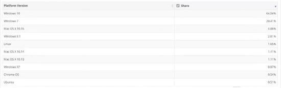 截至2020年10月,Windows XP的市场份额为0.87%,macOS X10.15小幅下跌,从5.11%降至4.88%。