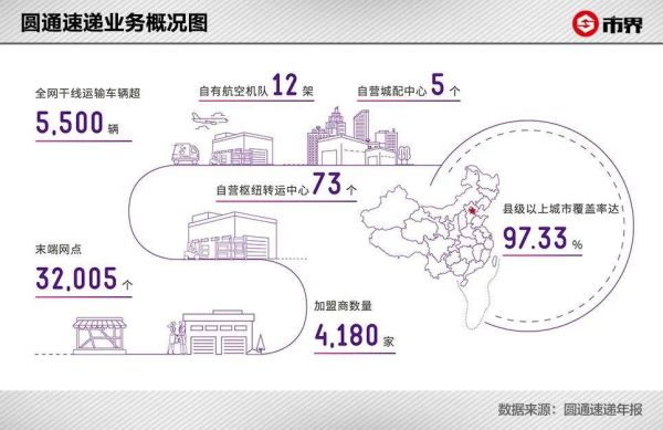 财报显示,圆通拥有加盟商4180家,自营转运枢纽73个,自营城配中心5个,末端网点32005个。