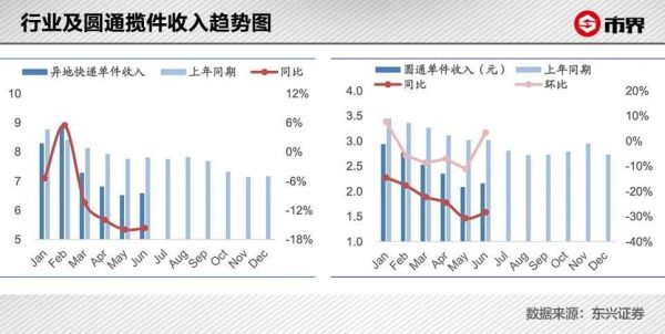 根据东兴证券的研究报告显示,今年年初至今,电商件领域爆发了极其激烈的价格战,异地件单件下滑高达15%,单件收入较去年下降1元多。通达系快递总部的单件收入,普遍从去年同期的3元跌至今年的2元出头,降幅也达到近1元,同比降幅近30%。