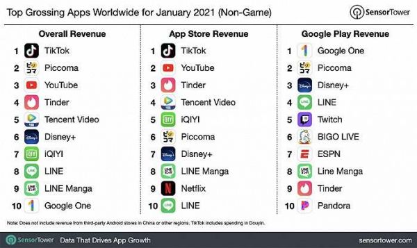 2月3日,移动应用商业情报分析机构Sensor Tower公布了2021年1月全球非游戏应用程序收入情况。