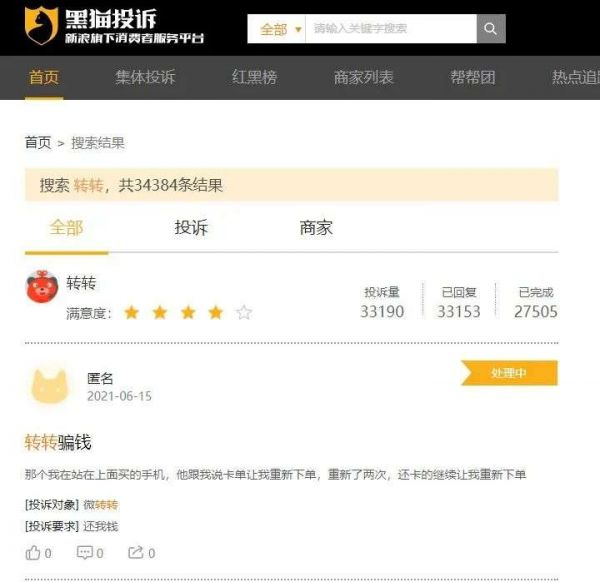 根据黑猫投诉,截至 7 月 6 日,转转被投诉量多达 33190 件,投诉理由诸如转转骗钱、欺骗消费者、验机报告与实物不符、生丢失配件等等。与宣传中帮助用户“多卖15%至20%的价格”严重偏离。面对用户释放出的强烈不满与愤怒,转转貌似有些无能为力。