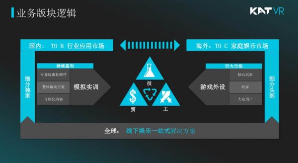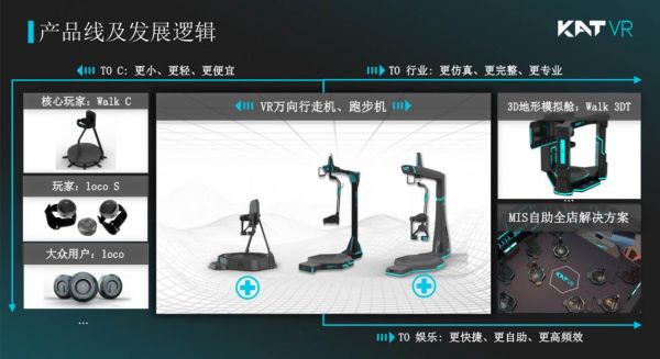 基于KAT Walk 系列VR万向跑步机系类产品,KATVR目前共有三种核心业务方向,分别针对TOC游戏玩家市场、TOB行业应用市场和线下娱乐市场。