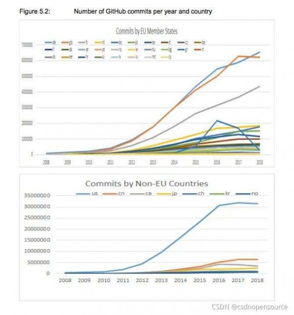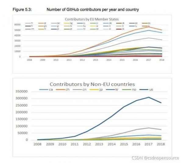 报告摘要中指出,开发人员对全球开源软件生态的影响呈现出地域性差别,在欧洲,往往是小型企业及独立开发者为全球开源软件生态做出贡献,而在美国,大部分是通过大型公司基于其已有的商业模式不断地改善源代码。