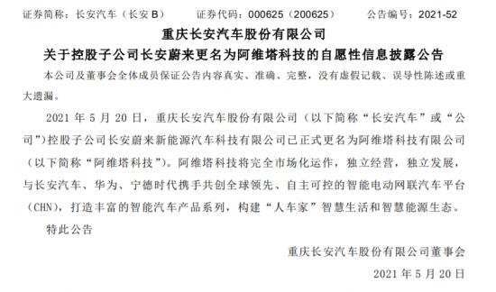 探究“阿维塔”这个品牌的前世今生,很容易发现它就是之前的“长安蔚来”。5月20日,长安汽车公告,公司控股子公司长安蔚来新能源汽车科技有限公司(简称“长安蔚来”)已正式更名为阿维塔科技有限公司(简称“阿维塔科技”),公告同时提到了和华为、宁德时代的合作。