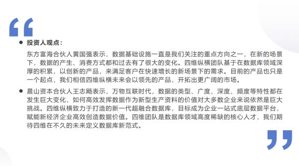 团队方面,「四维纵横」的核心创始团队均来源于数据库全球Top3的Greenplum。创始人兼CEO姚延栋是原Greenplum北京研发中心总经理,Greenplum中文社区创始人,PostgreSQL中文社区常委; CPO高小明是原Greenplum中国研发中心产品总监,曾就职于Oracle和IBM DB2数据库团队多年;CTO翁岩青是Pivotal中国研发中心资深架构师,具有丰富的 Greenplum和SQL-on-Hadoop产品内核开发经验。
