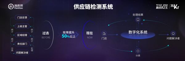 现在我们数字化系统能够让线下巡店效率得到大幅提升,巡检小组的成员抽取共性问题,把非结构化的评论变成结构化的标签,基于不同地域、不同类型做信息的系统化快速聚类,从而找到各项工作中的具像问题,反馈给不同层级的管理者,帮助他洞察需要做哪些工作,去推动线下服务质量提升。所以这是信息处理的效率。