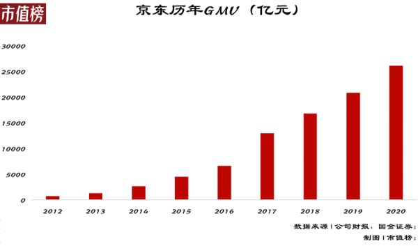 此后,京东走过了快速发展的几年,它的年度GMV从2012年的733亿元,增长到去年的2.6万亿元。