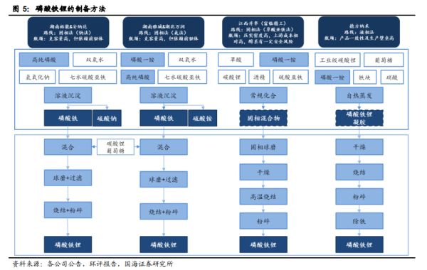 目前,磷酸铁锂正极材料制备方法大致有四种:固相法铵法、固相法钠法、固相法草酸亚铁法以及德方纳米的液相法。其中,前两种固相法以磷酸铁为前驱体,工艺成熟可控,且产品具有较高的压实密度,是目前使用最广泛的磷酸铁锂生产方法。