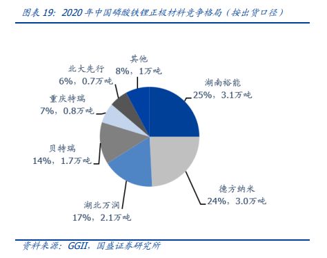 实际上,由于新能源汽车市场起步较晚,目前磷酸铁锂格局尚未稳固,市场集中度较为分散。以高工锂电统计数据看,在2020年,按出货口径统计湖南裕能、德方纳米、湖北万润市场占有率分别为25%、24%和17%,产出差距并不大。