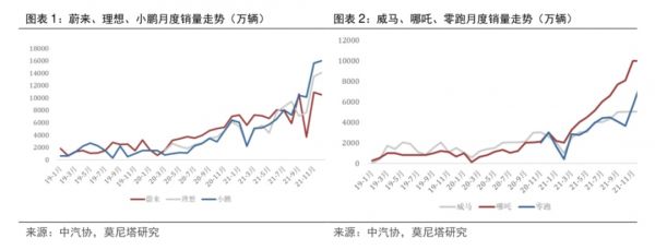 以他们三者为例,从最直观的交付量来看,威马、哪吒、零跑汽车2021年的年销量分别为44157台、69674台、43121台,较之“蔚小理”尚有一定差距。