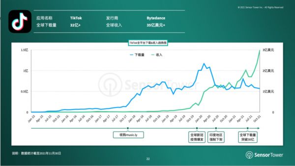 TikTok的全球下载量已超过32亿。图片来源:Sensor Tower《2021年娱乐应用市场洞察报告》