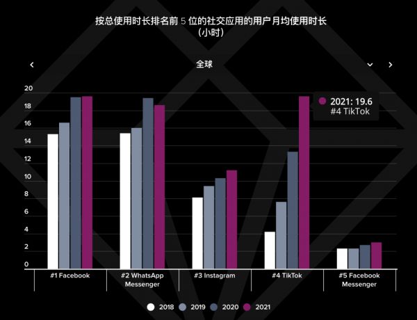 2021年,TikTok依旧是行业的领头羊,并且拥有深度的用户参与和年轻的用户群体。根据App Annie发布的《2022 年移动市场报告》,TikTok居于按使用时长排名的社交应用前5,其用户月均使用时长在2021年达19.6小时。