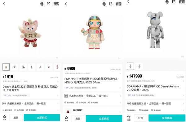 另据某潮玩卖家透露,泡泡玛特MEGA系列“Molly1000%地球的女儿”,原价4999元,得物标价一度高达8万元,如今该款已被下架。2021年新发布的““Molly400%地球的女儿”,原价999元,至2021年9月得物成交价一度高达12999元;即使至2022年行情略有回落,截至发稿售价仍有6989元。