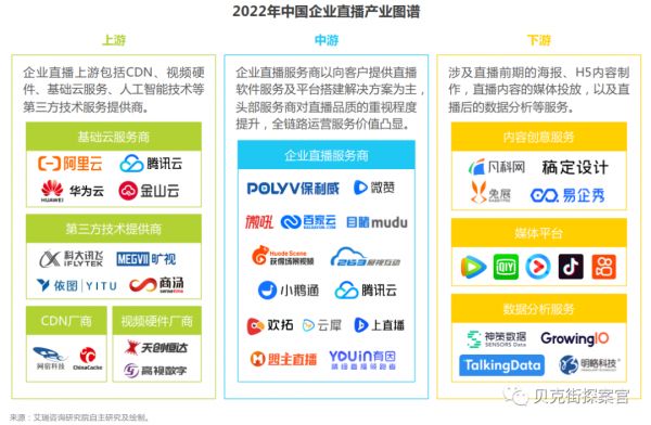就目前而言,由于企业直播用户越来越多,相关产业链也愈发成熟,相关产业链已经形成上中下游共同协作的局面,其中上游主要是第三方技术服务提供商;中游为企业直播服务商,主要是为客户提供直播软件服务及平台搭建解决方案;下游则是直播内容的媒体投放、物料制作服务提供商。