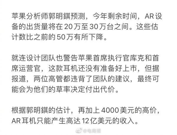 郭明錤:苹果将于2022年第二季度发布首款AR设备