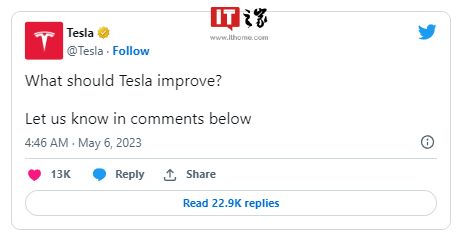 近日特斯拉的官方账号在推特上发问,想知道用户认为其应该进行哪些改进。结果用户纷纷评论回复,数量之多令人惊讶。截至IT之家发稿时,特斯拉的这个帖子已经收到了超过 2.2 万条评论。