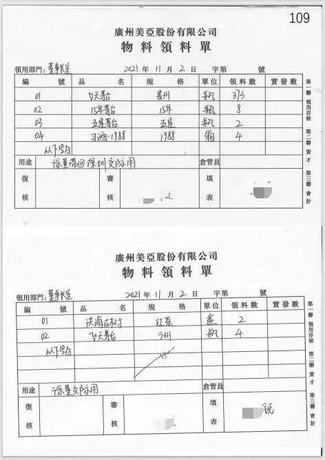 广州美亚的酒水领取单显示,用途一栏大量标注了“徐董交际用”“徐董带回深圳接待用”,只有极少数标注了“食堂饮用”和“接待山东客户用”。其中一张2021年11月2日的酒水领取单显示,徐立地一次性领取了373瓶飞天茅台瓶、8瓶15年茅台、2瓶五星茅台和4箱1988习酒。