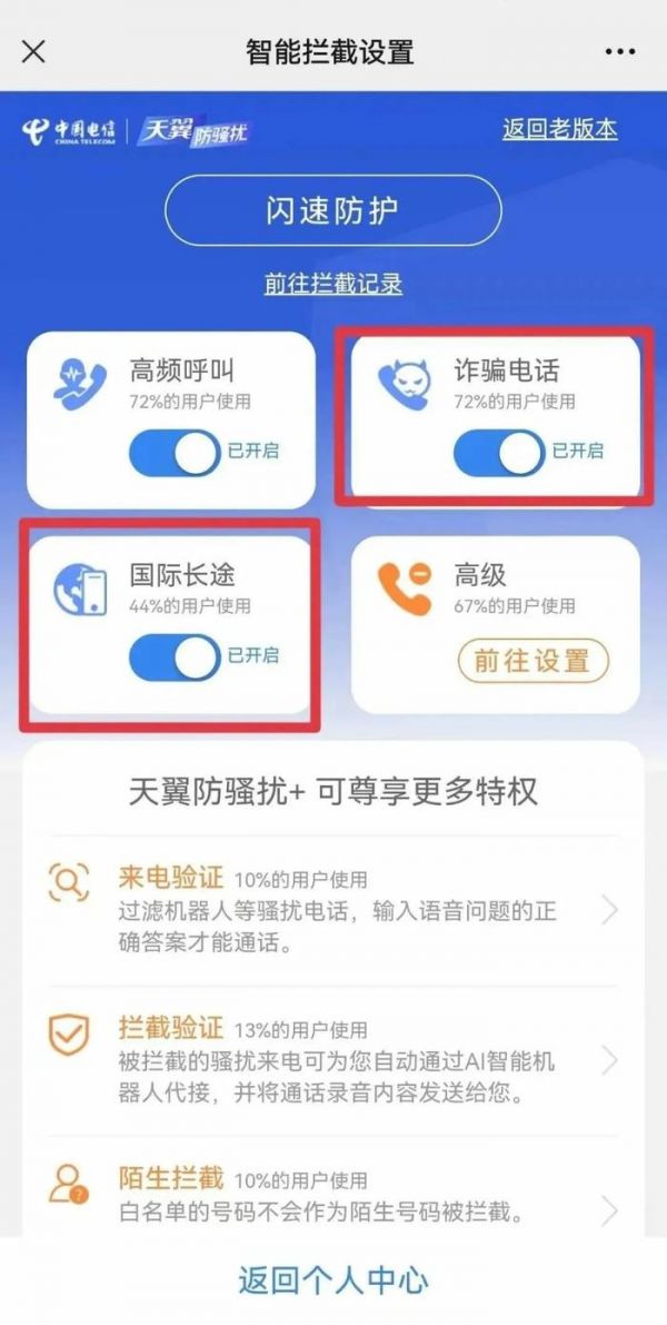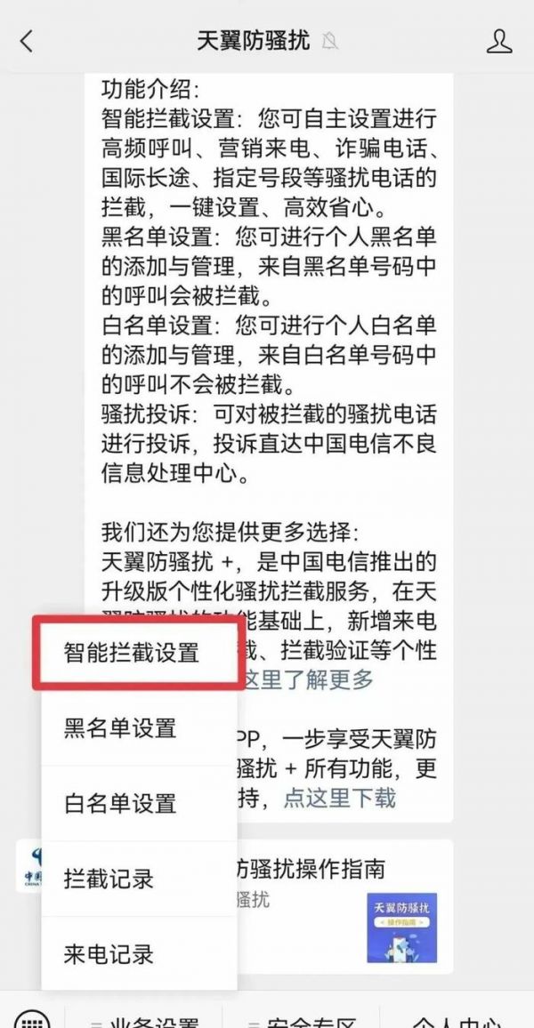 电信用户拨打10000转人工服务开启国际长途拦截,或关注“天翼防骚扰”微信公众号→业务设置→智能拦截设置→本机号码一键登录→立即开通→开通成功→立即体验→智能拦截→开启国际长途拦截→收到【天翼防骚扰服务提醒】短信。