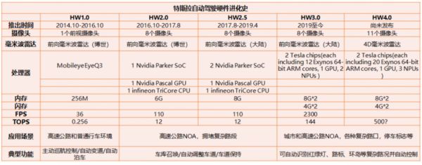 特斯拉自动驾驶最大的特色就是软硬结合,或者说硬件先行,软件升级。最早与Mobileye合作时,对应的是AP1.0,一直到与英伟达合作的AP2.5,本质上都是驾驶辅助系统,就是我们常说的L2级别。直到2019年4月,特斯拉HW3.0上线,AP才正式全面升级为FSD,也就是L4级别的自动驾驶系统。