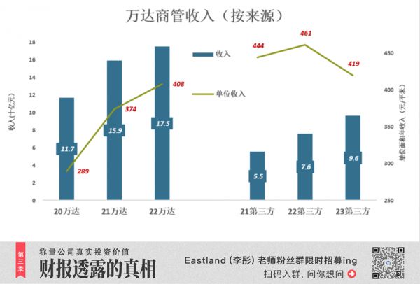 2020~2022年,来自万达集团的收入分别为117亿、159亿、175亿,占总营收的比重分别为67.9%、67.7%、64.5%,可谓相当稳定。期间管理面积增加了6.3%,收入却增长了50%。每平米年收入从2020年的289元增至2022年的408元。