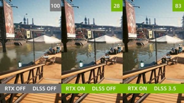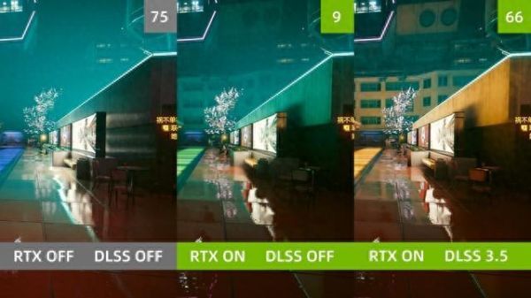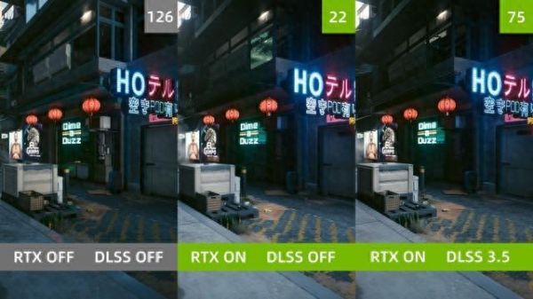 下面我们直接来看几组对比画面:对比截图分为RTX OFF DLSS OFF/RTX ON DLSS OFF/RTX ON DLSS 3.5。