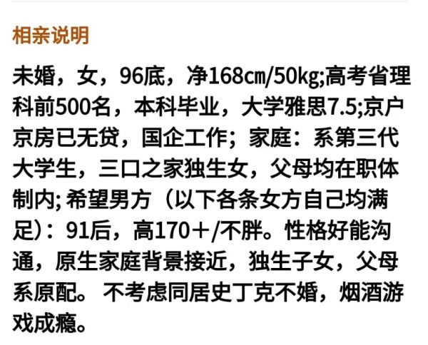 在这一部分,对相亲者本人的描述倒是千篇一律,无非就是那么几个夸孩子的词汇和语句来回排列组合:“我们的女儿/儿子,性格开朗,知书达理,孝顺热情,有上进心,会做家务.......”