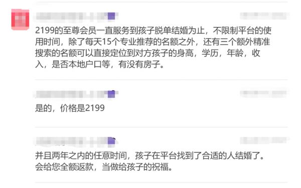 这一套下来,听着相当美好,仿佛家长只要买了会员,就能在资深恋爱红娘的指导和大数据的加持下,将自己的儿女精准地投送进婚姻的大门。