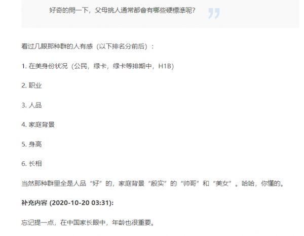 即便一个孩子毕业于排名前几的藤校,在大科技公司拥有一份薪水优渥工作,只要他还没有结婚,就会被其父母定义为“人生不完整”,就会被挂进所谓的“美国华人相亲群”,在异国的土地上进行传统的“高端婚姻速配”。