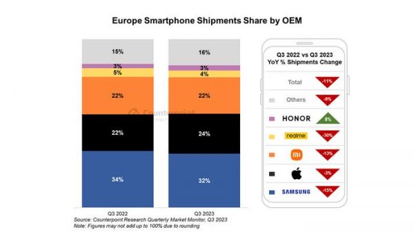2023Q3 欧洲手机市场报告:三星市占第一、荣耀唯一正增长
